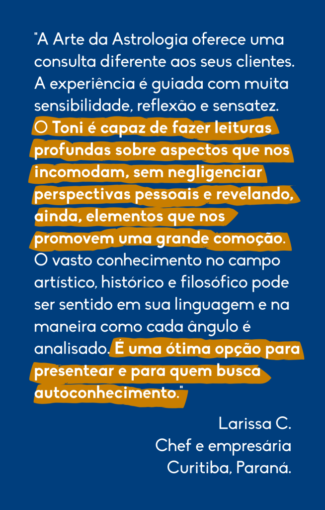 Então, depois de ter minha tese aprovada, eu imediatamente voltei aos estudos astrológicos que tinha começado 10 anos antes e criei este projeto. Consiste em ajudar as pessoas a potencializarem suas vidas e entenderem melhor os seus acontecimentos através das formas simbólicas e artísticas, seja pela divulgação dessas relações surpreendentes (via site, Instagram e Newsletter) ou pelas consultas astrais individuais.