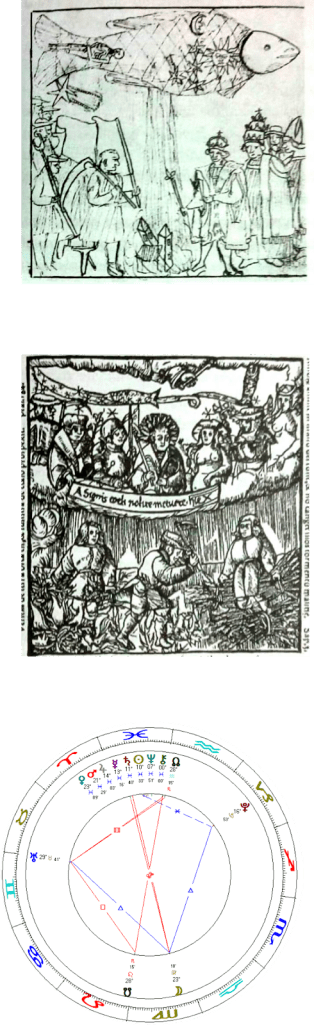 1) Página de rosto do trabalho de Leonhard Reymanm (1523). No alto um peixe imenso carrega na sua barriga o Sol, a Lua, e mais 4 astros (Marte, Vênus, Júpiter e Saturno). No seu rabo parece vir a morte. E dele jorra um grande dilúvio sobre uma cidade que é então arrasada. Em baixo, dividem-se os participantes ou espectadores da tragédia: de um lado, o imperador, o papa, e a corte, do outro lado, os camponeses encabeçados por um figura saturnina como porta-bandeira (carrega uma foice e perna de pau).