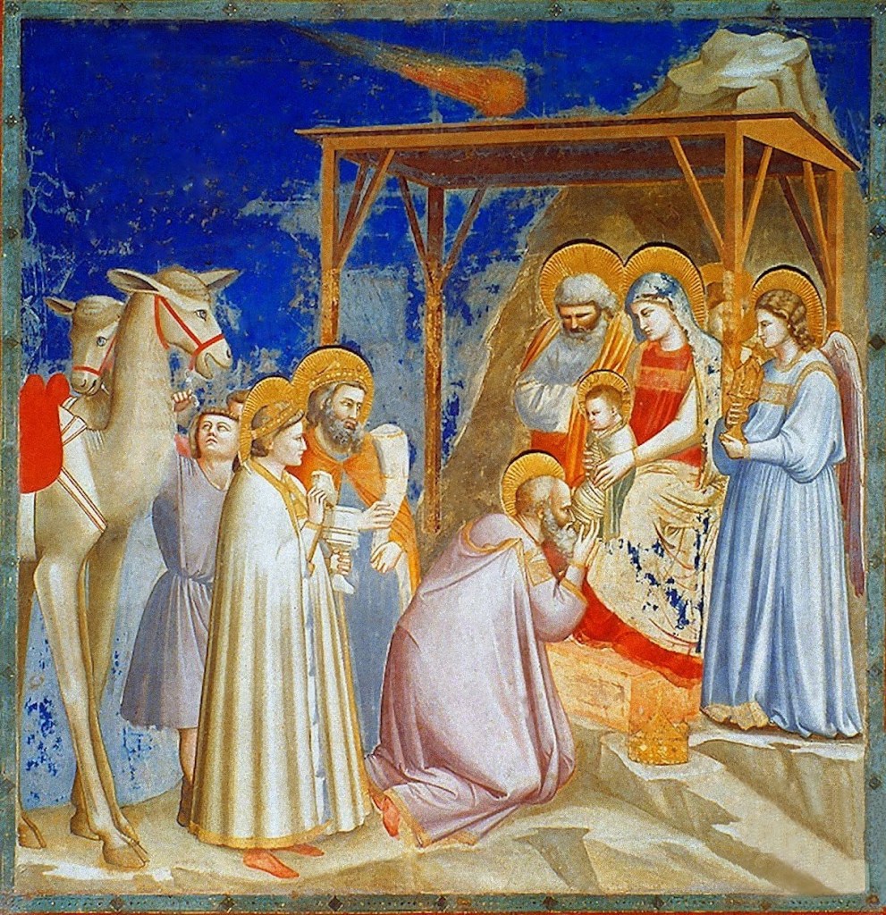 “Adoração dos Magos”, Capela Scrovegni, Pádua (Itália), 1303. Giotto de Bondone parece ter sido o primeiro artista dar à Estrela de Belém uma forma baseada em um fenômeno astrológico. Alguns chegaram a sugerir que ele havia se inspirado na passagem do Cometa Halley pelos céus italianos em 1301.