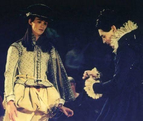 Eddie Redmayne e Mark Rylance como, respectivamente, Viola/Cesário e Olívia em cena de “Noite de Reis”, 2002, no Middle Temple Hall. Afim de redobrar o jogo de representações sexuais da peça, esta montagem retomou a prática dos tempos de Shakespeare em que todos os papeis, inclusive os femininos, eram desempenhados por atores homens.